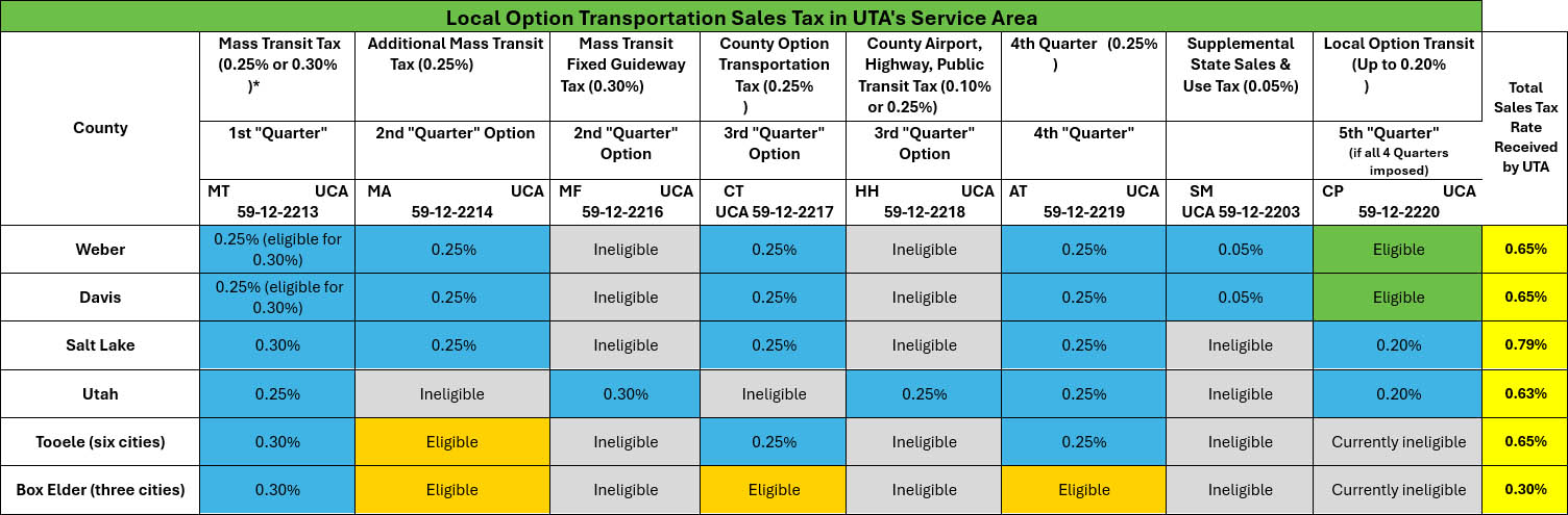 In the table* below, the blue highlighted cells show the maximum percentage the county may opt to allocate to UTA. The yellow highlighted column shows the actual percentage of sales tax revenue UTA received from each county in 2024.